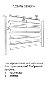Все наши заборы состоят из секций (см. схему секции). Секция состоит из вертикальных направляющих, горизонтальной планки, усилителя и ламелей.